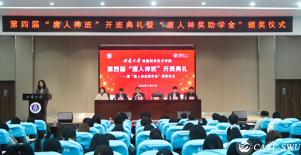 孙海军宣读第四届“唐人神班”学员名单。第四届“唐人神班”学员代表王振荣在发言中以“感激与责任”表达心声,代表全体学员立下“潜心求学、精诚团结、勇于实践”的誓言,表达了新时代农科学子扎根产业、服务“三农”的坚定志向与决心。陈佩宣读“2024-2025学年唐人神奖助学金”获奖名单,主席台就座的领导、嘉宾为获奖学生颁发证书,随后为“唐人神班”班主任、班委颁发了聘书。